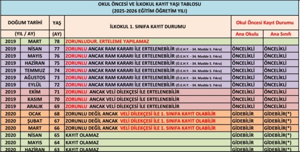 Belirtilen aylarda doğan öğrencilerin aday kayıt bilgileri e-okul sisteminde 2024 - 2025 Eğitim Öğretim yılına ait işlemler tamamlandığında sistemde yer alacaktır. Tabloda yer alan yaş gruplarında öğrencisi bulunan velilerimiz kayıt işlemlerinin başladığına dair duyurumuzun ardında okulumuza gelerek kesin kayıt işlemlerini yaptırabileceklerdir. Tahmini olarak kayıt işlemleri Temmuz ayının sonu Ağustos ayının başı gibi başlayacaktır.